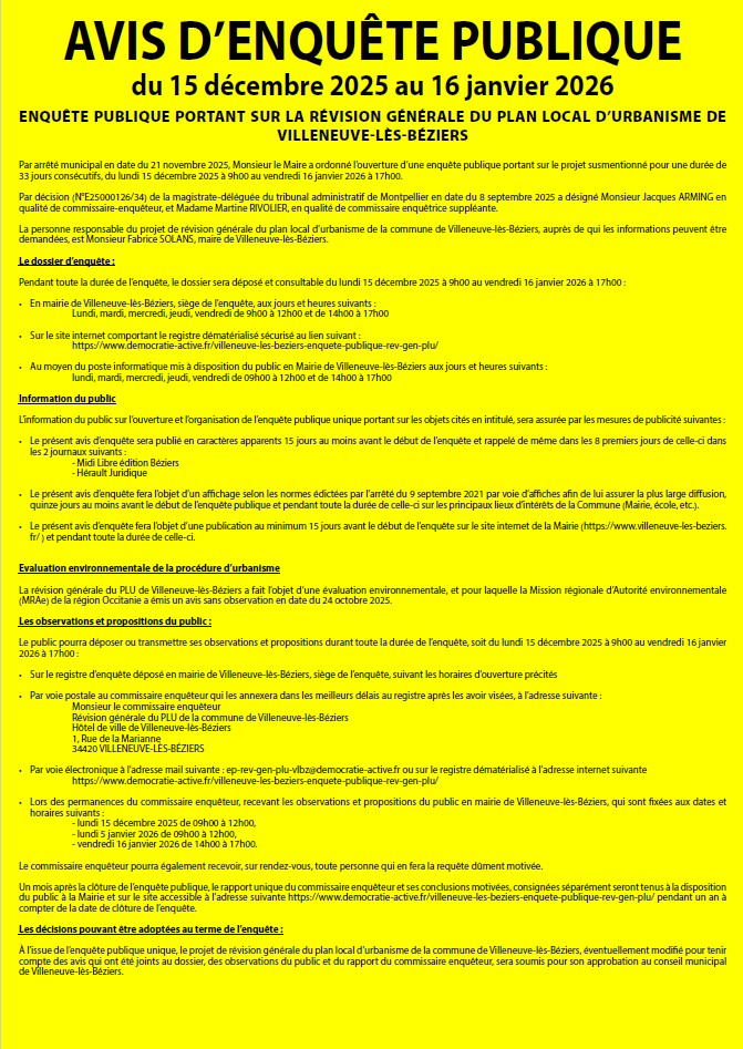 https://www.democratie-active.fr/villeneuve-les-beziers-enquete-publique-rev-gen-plu/ - Office hours of the investigating commissioner: